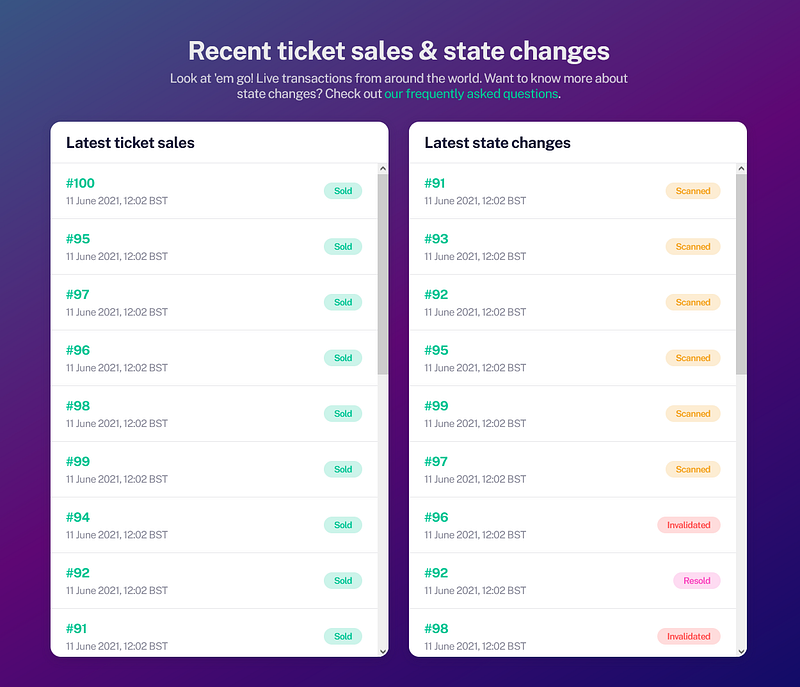 Recent ticket sales and state changes update in real time to give a concrete picture of current ticketing operations occurring through GET Protocol around the world. By clicking on a specific index across both sets of metrics, the user is taken to that specific ticket’s lifecycle page.